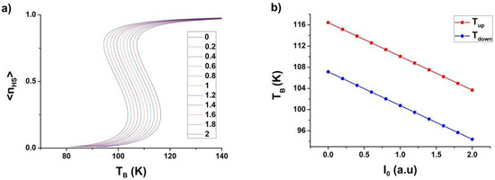 (a) Simulated bath-temperature (TB) dependence of the HS fraction under various light intensities (from 0 to 1, given in arbitrary units) for, , showing a monotonous linear shift of the hysteresis loop. (b) Light intensity dependence of the upper and the lower transition temperatures of the thermal hysteresis leading to parallel lines. Used parameter values are: , , , and .