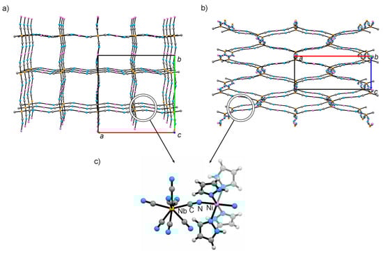 Ni2Nb shows some interesting structural distortions when pressurized using a Merrill–Bassett DAC [14]. Its structure under pressure was determined by scXRD (Figure 1 and Table 1) [13]. Ni2Nb crystallizes in a tetragonal space group I41/a and forms a three-dimensional (3-D) CN-bridged skeleton with a flattened diamond-like topology where the niobium and nickel ions are all linked by cyanide ligands. The niobium(IV) centers play the role of the four-fold tetrahedral nodes in the 3-D framework of Ni2Nb (Figure 1a,b).