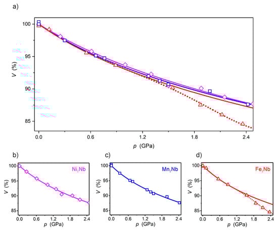 Combined graph (a) of V/V0(p) dependencies for Ni2Nb (magenta) (b), Mn2Nb (blue) (c) and Fe2Nb (red) (d). The solid lines are the best fit to the Birch–Murnaghan equation of state (BMEOS). The dotted line for Fe2Nb above 1.2 GPa is only a guide for the eye.