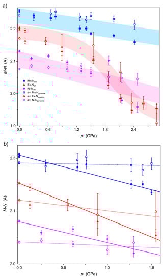 Pressure dependence of the M–NCN bond lengths (full symbols) and M–Npyrazole (open symbols) in the full pressure range (a) and in the pressure range where only linear changes are observed (b) for Ni2Nb (magenta), Mn2Nb (blue) and Fe2Nb (red). Highlights in (a) are only for guiding the eye, while the lines in (b) are the best linear fit: solid for M–NCN and dotted for M–Npyrazole.