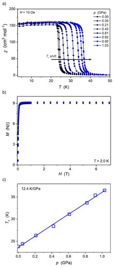Ni2Nb is a ferromagnet due to the local ferromagnetic interactions between NbIV and NiII ions [13] with the Curie temperature (TC) of 13.2 K. It exhibits a completely different type of magnetic response to high pressure (Figure 6) when compared to the other two analogs Mn2Nb and Fe2Nb. The TC of Ni2Nb decreases with increasing pressure, which is characteristic for ferromagnets [20,21], and confirms the presence of local ferromagnetic interactions between NbIV and NiII. The TC shift is 1.9 K GPa−1, as obtained from the linear fit of the TC(p) dependence (Figure 6c, TC is the position of the dχ/dT peak in the χ(T) measurement at 10 Oe). The pressure response of Ni2Nb is much weaker and opposite to Mn2Nb, where the antiferromagnetic interactions between NbIV and MnII are present. Hence, the underlying local magnetic interactions in Ni2Nb (ferromagnetic) vs. Mn2Nb (antiferromagnetic) are the source of the observed difference. The shortening of the Ni–NCN bonds favors the resonance integral and makes the antiferromagnetic contribution to the total exchange interaction stronger while destabilizing the ferromagnetic one. Overall, the JNiNb coupling constant decreases under pressure.