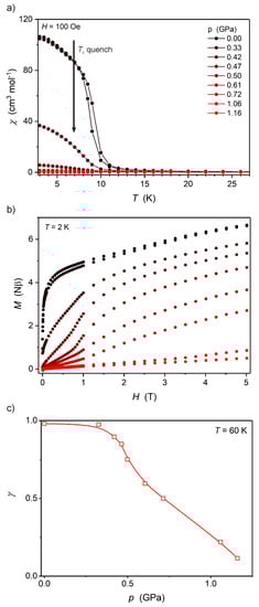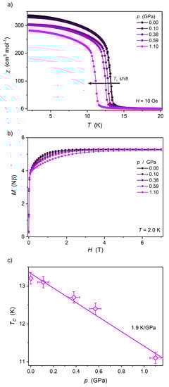 Ni2Nb does not present a loss of the magnetic moment under high pressure, which is confirmed by the pressure-independent magnetization at saturation values of 5.3 Nβ (at 2.0 K and 7 T; Figure 6b) up to 1.10 GPa and the structural pressure response that matches the BMEOS. The magnetization at saturation values are close to 5.2 Nβ, as expected for two NiII (S = 1) and one NbIV (S = ½) coupled ferromagnetically (assuming gNb = 2.0 and gNi = 2.1 [22]).
