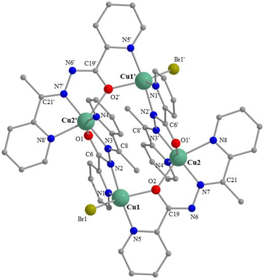 3.2. Synthesis of Complex [Cu4Br2(L)4]Br2·0.8H2O·MeOH (1·0.8H2O·MeOH)