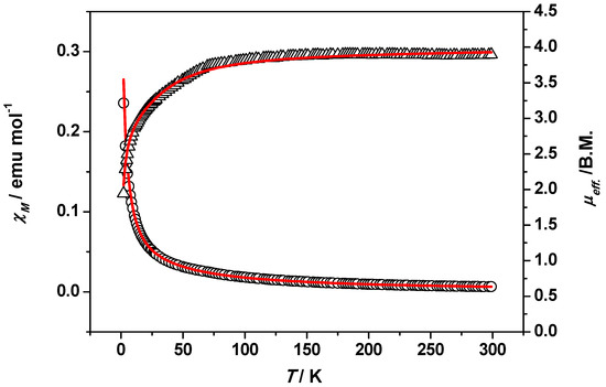 The use of this model yielded good agreements between the experimental data of the molar paramagnetic susceptibility and magnetic moment with their corresponding calculated data. Figure 3, Figures S5 and S6 show the experimental and calculated curves of magnetic molar susceptibility and magnetic moment versus temperature for compounds 24. Table 3 collects the magnetic parameters (µeff., D, g, zJ, TIP and P) obtained from the fitting of the experimental values together with the quality of the fits. The obtained values for the zero field splitting parameter are in the range 43.00–62.72 cm−1 which are similar for other similar tetraamidato complexes [12,13,14]. The low negative values obtained for zJ in the three complexes (−0.93, −0.79 and −1.11 cm−1) indicate weak antiferromagnetic interactions between the dimetallic units. These low values are consistent with the zigzag chain structure observed in these complexes, where the magnetic coupling should be propagated through the thiocyanate bridges, although a through-space interaction cannot be ruled out.