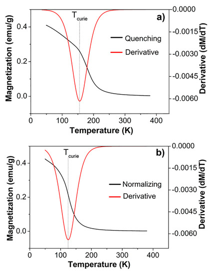 Castañeda, E.J.G.; Castro, R.E.B.; Briseño, A.C.; Arguijo, B.F.; Castillo, A.A.T.; Rodríguez, A.S.; Galindo, J.T.E.; Sánchez, S.A.P. Effect of Quenching and Normalizing on the Microstructure and Magnetocaloric Effect of a Cu–11Al–9Zn Alloy with 6.5 wt % Ni–2.5 wt % Fe. Magnetochemistry 2019, 5, 48. https://doi.org/10.3390/magnetochemistry5030048