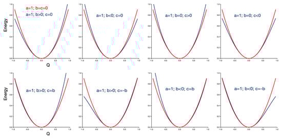 Figure 1. Influence of the cubic (b) and quartic (c) corrections (in blue) on the harmonic potential energy curve (in red). | b | and | c | are 0.2 when non-zero.