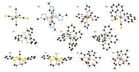 Figure 2. Molecular complexes investigated in this study: [Fe(NCS) 2 (NCH) 4 ] (a), [Fe(mtz) 6 ] 2 + (b), [Fe(iso) 6 ] 2 + (c), [Fe(phen) 2 (NCS) 2 ] (d), [Fe(pic) 3 ] 2 + (e), [Fe(bpy) 3 ] 2 + (f), [Fe(terpy) 2 ] 2 + (g), [Fe(CO)(N H S 4 )] (h), [Fe(NH 3 )(N H S 4 )] (i), [FeL(CN) 2 ]·H 2 O (j), and [Fe(acac) 2 trien] + (k). Fe is in the center of the complexes, represented by a light brown sphere. Black spheres represent C; blue is N; red is O; yellow is S; and pink is H.