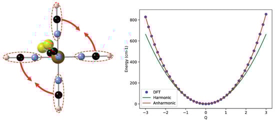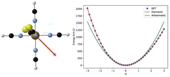 As an example of cubic corrections to the harmonic approximation, we mention the vibrational mode mainly characterized by the off-center movement of Fe as shown on the left of Figure 4. When the iron moves away from the NCS groups (in the direction of the red arrow), the energy rises less rapidly than when it moves towards these groups. The harmonic frequency of this mode is 343.7 cm 1 , and the fitting of the DFT energies introduces a cubic term of −13.6 and an anharmonic frequency of 347.8 cm 1 . The quartic term is small in this case. The ZPE is again larger, but now, the spacing between the vibrational levels of the anharmonic curve remains constant within 0.1 cm 1 .
