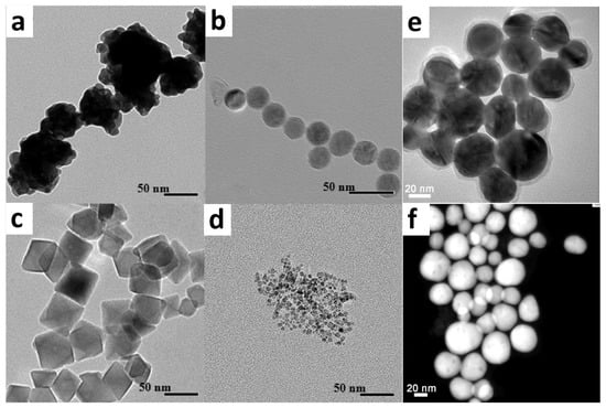 Various magnetic nanoparticles coated with gold shells: (a–d) TEM images of Fe3O4-core/Au-shell magnetic nanoparticles synthesized according to different experimental procedures: (a) [57], (b) [58], (c) [57,58], (d) [59]; see more details in [54]. (e,f) TEM and STEM (scanning transmission electron microscopy) images, respectively, of the γ-Fe2O3-core/Au-shell magnetic nanoparticles [60] (parts of this figure were adapted from [54] with permission).