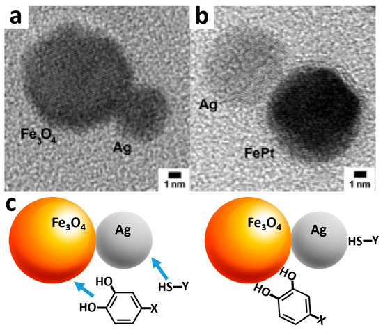 (a,b) TEM images of Fe3O4-Ag and FePt-Ag hetero-dimers composed of the magnetic nanoparticle and connected Ag nanoparticle [75]. (c) Directed functionalization of the Fe3O4 nanoparticle and Ag nanoparticle with different functional units, such as dopamine-derivatized and thiol-derivatized species, respectively. X and Y might be represented by different molecular and biomolecular species (part of this figure was adapted with permission from [75], American Chemical Society, 2005).