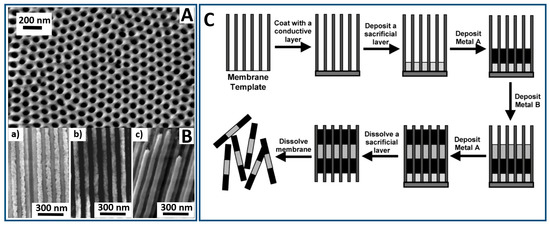 (A) Scanning electron micrograph, SEM, (top view) of a typical hexagonally ordered nanoporous alumina template with a pore diameter of 70 nm and an interpore distance of 100 nm. (B) SEM cross-sectional view of alumina membranes filled with Fe nanowires deposited from electrolytes containing: (a) 0.1 M FeSO4, (b) 1 M FeSO4 and (c) 0.5 M FeSO4 + 0.4 M H3BO3. (C) Schematic description of the membrane-template electrochemical preparation of multifunctional nanowires. (Parts A and B were adapted from [102] with permission; part C was adopted from [103] with permission).