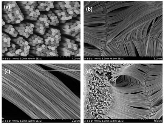 Scanning electron micrographs (SEM) of Ni nanowires with average diameter of 98 nm and length of 17 µm after removal of alumina templates. (The figure was adapted from ref. [101] with permission.). Images (a-d) show various examples of Ni nanowires prepared in alumina templates.