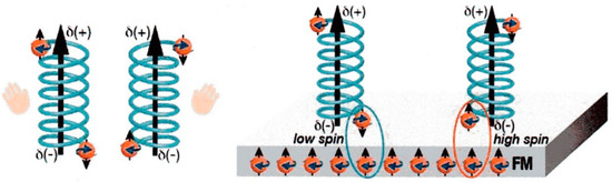 This scenario of ae induced in aligned molecules in a magnetic field brings us to a remarkable experiment by Banerjee-Ghosh et al. [57], which demonstrated that the interaction of chiral molecules (like helical oligopeptides) with a perpendicularly magnetized substrate is enantiospecific. One enantiomer adsorbs preferentially to a ferromagnetic surface when the magnetization points up, whereas the other adsorbs faster for the opposite alignment of the magnetization. They ascribed this to a chirality-induced spin selectivity (CISS) effect [58]: when chiral molecules are polarized by an electric field, the electric polarization is accompanied by an electron spin polarization with spin up or down at each end of the induced dipole, depending on the specific enantiomer (Figure 4, left). Here a charge polarization develops as the molecule approaches the surface, which induces the electron spin polarization responsible for the enantioselection (Figure 4, right). The proposed detailed mechanism involves an exchange interaction between the molecular electron spins and the spins of the ferromagnetic substrate, with the substrate–molecule interaction stabilized if the two spins are antiparallel (low-spin arrangement) and destabilized if they are parallel (high-spin arrangement). The phenomenon appears to fit within the realm of false chirality, with the polar time-even alignment vectors of the chiral molecule collinear with the axial time-odd spin vectors of the ferromagnetic surface. This perception is reinforced by the fact that for long adsorption times enantioselection is lost, meaning the effect disappears at equilibrium (i.e., a kinetic effect), which is a sine qua non for ae under a falsely chiral influence. This experiment was extended to demonstrate enantioseparation by crystallization on a ferromagnetic surface [59].