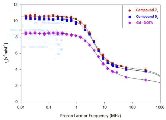 Nuclear magnetic relaxation dispersion (NMRD) profiles of the compounds 5a and 7a compared to the DOTAREM® profile fitted with the Solomon and Bloembergen theory. The parameters extracted from these profiles are listed in Table 1.