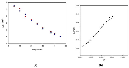 The relaxivity has been measured at several temperatures in order to evaluate the exchange regime of the coordinated water molecule (Figure 3a). Both complexes show a continuous decrease of the relaxivity with increasing temperature and can then be qualified as fast-exchange complexes characterized by a short τM (of about 100 ns or lower) [,]. The exact τM was determined by 17O NMR for the complex 7a and a value of 53.07 ± 1.76 ns was obtained (Figure 3b). This confirms the fast exchange of the coordinated water molecule for both complexes 5a and 7a, which will not limit the relaxivity.