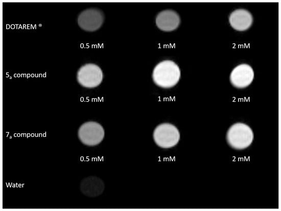 On these images, we can notice a highlight of the 5a and 7a samples compared to the Gd-DOTA compound for each studied concentration, with no significant differences between 5a and 7a compounds.