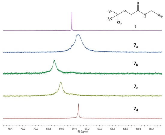 19F NMR spectra of compound 6, in purple (5 mM) and 7a–d in blue, dark green, khaki and red (3.7 mM, 13.7 mM, 17.2 mM and 12.8 mM respectively).