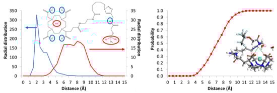 As a prerequisite to the molecular dynamics calculations, the Dreiding force field [], which was not originally specifically developed to study lanthanide derivatives, was first adapted to make it suitable for reproducing intra and intermolecular interactions of gadolinium-based contrast agents (see the details in the experimental section). With this reparameterized Dreiding force field, we performed a conformational search analysis to identify the most stable structure of 7a. Then, molecular dynamics simulations with that structure as the starting point were run at room temperature, and the distances between the gadolinium center and fluorine atoms were measured along the MD trajectories (see Figure 7). Interestingly, the results show that the vast majority of fluorine atoms are sitting at distances ranging from 4.5 Å to 10 Å from the gadolinium center. This means that the molecule is folded, since the length of the fully extended fluorinated chain is ~25Å.