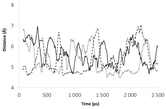 Time evolution of the distance between the gadolinium center and the three water molecules; each curve corresponding to one given water molecule.