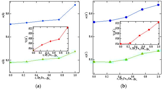 Lattice parameters a and c and unit cell volume of (a) Dy2Fe17−xZrx and (b) Dy2Fe16Ga1−xZrx as a function of Zr content.