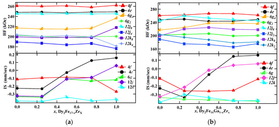 The hyperfine parameters derived from the fitting are listed in Table 4, and the hyperfine field (HF) and isomer shifts (IS) are plotted in Figure 8a,b. There exists a direct correlation between hyperfine field values of a site with its near neighbor (NN) iron sites. In the case of the Th2Ni17 structure, the 12k site has nine NN Fe sites (one (4f), two (6g), four (12j), two (12k)), the 12j site has 10 NN Fe sites (two (4f), two (6g), two (12j), four (12k)), the 6g site has 10 NN Fe sites (two (4f), zero (6g), four (12j), four (12k)), and the 4f site has 11 NN Fe sites (one (4f), three (6g), six (12j), three (12k)). Following the NN distribution, the observed HF values are in the order 4f(6c) > 12j(18f) > 6g(9d) > 12k(18h), which is similar to the sequence observed in other R2Fe17 compounds [40,41]. It is obvious that the 4f(6c) site has the maximum hyperfine field, since it has the maximum number of Fe nearest neighbors, whereas the 18h(12k) site has the minimum number of Fe neighbors and, consequently, has the lowest HF value. Although 6g(9d) and 12j(18f) sites have the same number of Fe neighbors, the former has comparatively smaller Fe–Fe distances and, hence, a larger hyperfine field. The hyperfine field (Bhf) decreases with increasing Zr content. The decrease in the hyperfine fields could be from the decrease in magnetic moments of iron in Dy2Fe17−xZrx. It is found that 9.23% of total area is occupied by the DyFe3 paramagnetic phase for x = 1 Zr content. This observation supports the formation of an additional paramagnetic phase DyFe3 as confirmed from the XRD Rietveld refinement.
