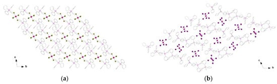 The PPh4+ cations in both of the compounds show several intermolecular phenyl–phenyl interactions that provide noticeable supramolecular conformations. Indeed, the sextuple phenyl embrace (SPE) supramolecular conformation is present in both 1 and 2 (Figure S1) [43,44,45]. The shortest P···P distance between PPh4+ cations displaying the SPE conformation is ca. 6.07 and 6.13 Å for 1 and 2, respectively. Additionally, weak intermolecular X···H-C (the shortest X···C distance being 3.66 (1) and 3.85 Å (2)) and X···π (halide-centroid distance of 3.66 (1) and 4.4 Å (2)) interactions between anions and cations contribute to stabilizing the crystal structure of the two compounds.