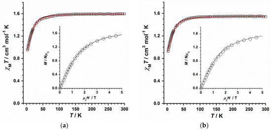 A field dependence of the molar magnetisation (M) plot for 1 and 2 at 2.0 K is given in the respective insets of Figure 3a(1),b(2). In all the cases, the M values display a continuous increase with the applied magnetic field, the higher M values being 1.57 (1) and 1.53 µB (2) at 5.0 T, which are in agreement with those of similar mononuclear ReIV complexes that were reported in the literature [18,27,28,29,30,31,32,33,34,35,36,37,38,39,40,41]. Given that no significant intermolecular interactions are observed in the crystal structures of 1 and 2, as indicated in the structure description, the shortest intermolecular Re-X···X-Re distances are covering the range of 5.93–6.52 Å, we have performed the treatment of the experimental data of the χMT versus T plots through the anisotropic Hamiltonian of Equation (1) (where Ŝz is the easy-axis spin operator, H is the applied field, β is the Bohr magneton, g is the Landé factor, and D is the ZFS for the ReIV ion).