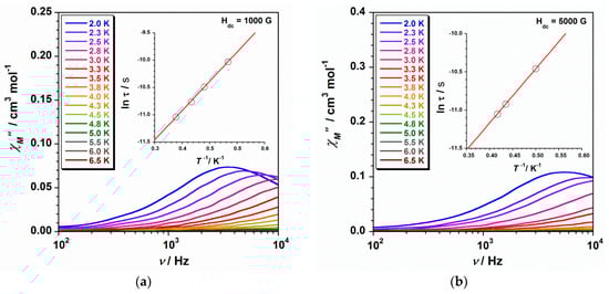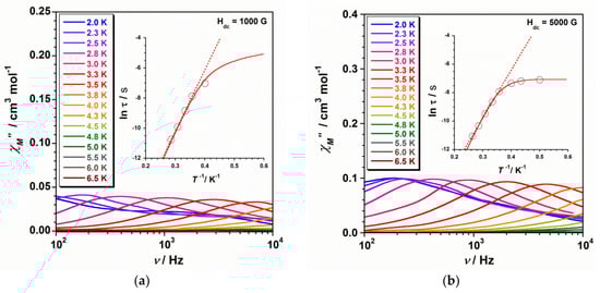 Alternating current (ac) magnetic susceptibility measurements were performed on microcrystalline samples of 1 and 2 in the temperature range of 2–7 K and in a 3.5 G ac field oscillating at different frequencies. In both cases, no out-of-phase ac signals (χ″M) are observed at Hdc = 0 G. However, out-of-phase ac signals, with observable χ″M maxima, take place at low temperatures in 1 and 2 when an external dc magnetic field (Hdc = 1000 and 5000 G) is applied (Figure 4 and Figure 5). This magnetic behaviour would indicate that the two studied systems (1 and 2) exhibit slow relaxation of the magnetisation and, therefore, single-ion magnet (SIM) phenomenon [1,2,3,4,5,6,7,8,9,10,11,12,13,14,15,16,17,18,19,20,21]. Nevertheless, the relaxation dynamics that the two compounds exhibit is not equally affected by the external dc magnetic fields. While the Hdc = 5000 G seems to be optimal for compound 1 (with the presence of more χ″M maxima that shift towards higher frequencies), this magnetic field results in being less useful for studying the magnetic relaxation in 2, where a decrease of the number of χ″M maxima in the χ″M versus ν plot occurs (Figure 4 and Figure 5). In both 1 and 2, the intensity of the χ″M peaks increases with increasing the external dc magnetic field.