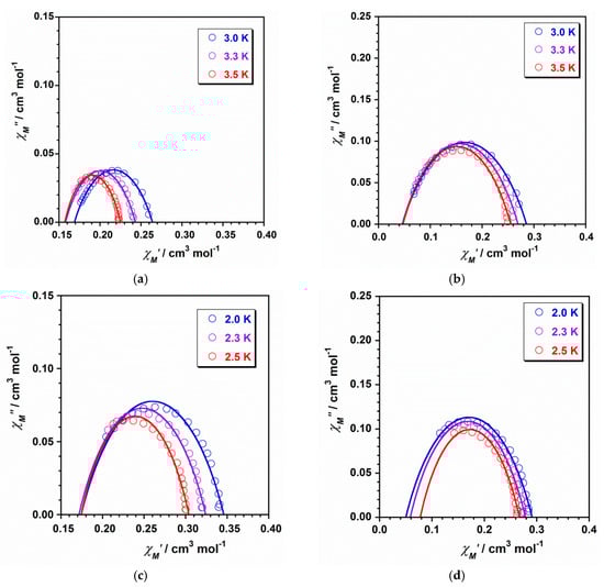 Cole–Cole plots for 1 (a,b) and 2 (c,d) obtained from the experimental data of the out-of-phase ac susceptibility signals under dc fields of 1000 (a–c) and 5000 G (b–d).
