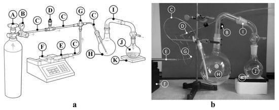 (a) Schematic (b) photograph of system configuration. A: Ultra-high purity (UHP) nitrogen 99.998%, B: single stage regulator set to 100 psi, C: 0.02” stainless-steel tubing, D: fine metering valve E: 2.5 mL stainless steel high pressure gastight syringe (with 25.1% w/v ammonia), F: syringe infusion pump, G: mixing tee (20 μL), H: 1,000 mL round bottom flask, I: vacuum distilling adapter, J: 250 mL flat bottom flask with 100 mL iron salt (Fe2+/Fe3+) solution, K: permanent neodymium magnet.