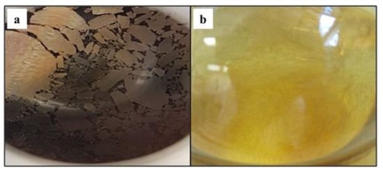 Solutions of iron salts (2:1, mol:mol, Fe2+:Fe3+) [31], in equilibrium with steady-state [NH3(g)] headspace, developed color changes from clear, light yellow to black as insoluble magnetite was synthesized, as described in Equation (2). Importantly, initial studies involving total concentrations of ferrous and ferric 10 mM to molar, all of which resulted in little to no MNP yield. Visible are sheets of iron oxides at the iron salts solution surface at 10 mM, Figure 3a, which then resulted in a physical barrier to NH3(g) diffusion. Reducing total iron concentrations to 3.8 mM, Figure 3b, resulted in controlled MNP synthesis with ferrous and ferric ions and OH¯ from NH3(g) in equilibrium with aqueous (Equation (1)). This resulted in visible discrete streams of MNPs at the reaction interface which were drawn from the reaction interface through the bulk solution.