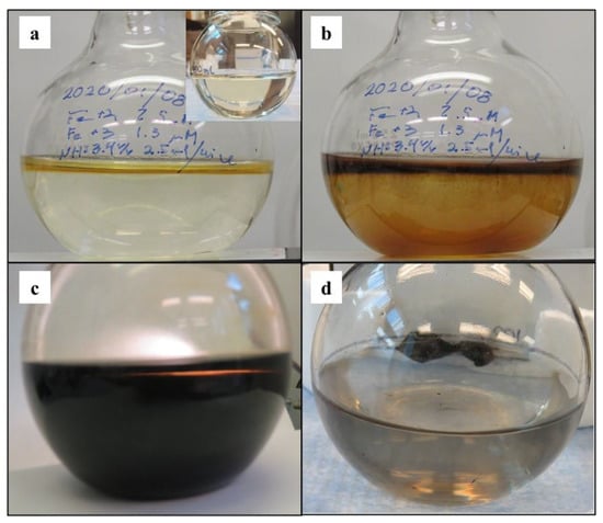 Magnetite synthesis was observed at the interface (Figure 4a) within 2 min following equilibrium development with steady-state NH3(g) headspace. Magnetic particles were magnetically drawn from that interface, into the high [H+] bulk solution (Figure 4b), terminating particle growth [15]. The suspension was black within 90 min (times for complete synthesis were approximately 90 min, regardless of [NH3(g)] headspace studied in our work) (Figure 4c), after which Vessel J was removed from the apparatus, lightly swirled, and a neodymium magnet was placed on the vessel wall. The suspension was stable for at least 3 months at 4 °C, under nitrogen. The clear aqueous fraction, (Figure 4d), pH ~6 to 7, was analyzed using ICP-MS. Post synthesis, residual iron concentrations were 42 ± 18 ppb, compared to 210 ppm initial, which was >99.9% reaction of the iron salts.