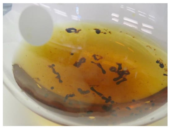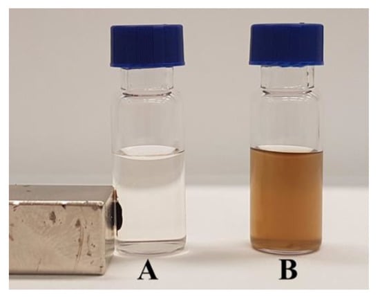 MNP added to solutions of tetracyclines: in a magnetic field (A) and suspended in the solution (B).