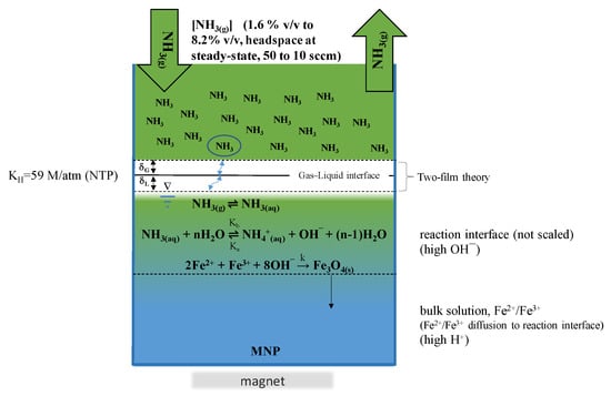 Illustration of the proposed magnetite (Fe3O4) nanoparticles (MNP) synthesis (3.8 mM ∑Fe and 2:1 Fe2+:Fe3+) with NH3(g).