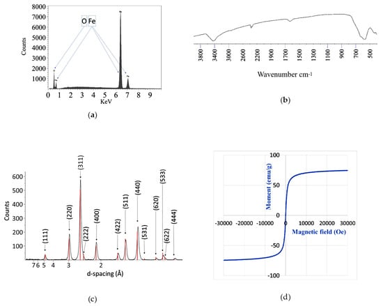 Analysis of powdered synthesized nanoparticles by: (a) energy dispersive X-ray fluorescence (EDXRF); (b) Fourier transform infrared spectroscopy (FTIR); (c) X-ray diffraction (XRD) with overlay from reference library in red; (d) magnetization saturation.