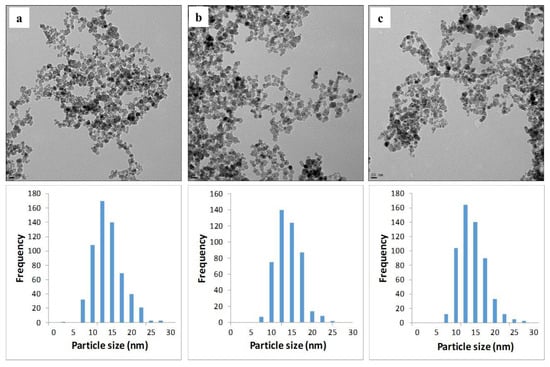 Representative, replicate analyses of TEMs, (Figure 8) for 3.8 mM total Fe2+:Fe3+ with variable [NH3(g)] headspace demonstrated repeatable MNP syntheses; TEMs among analysts were also compared, and over time, with no distinguishable differences based on particle shapes and sizes (Table 1). Incomplete synthesis products, such as lepidocrocite, goethite, and hematite [15,19,20] were not observed in any TEMs.