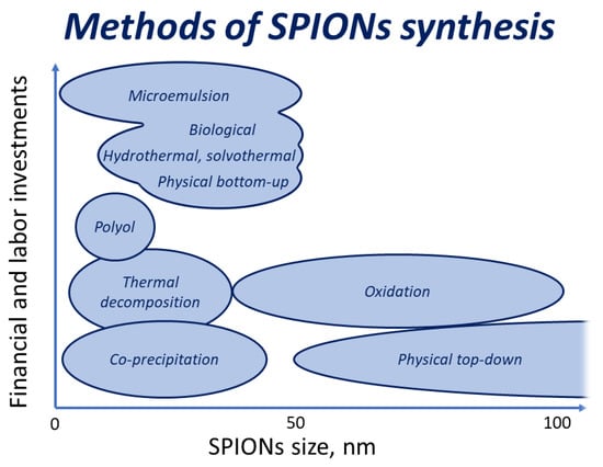Thus, there is a wide range of methods for the synthesis of nanoparticles of superparamagnetic iron oxides. These particles of size 1–40 nm can be obtained by coprecipitation of iron (II, III) salts. This method is characterized by the low cost of reagents and equipment. It is easy to carry out and it does not allow obtaining monodisperse particles of a certain shape. The morphology of SPIONs obtained by oxidation of iron and its oxides is determined by the morphology of the particles of the precursors and the temperature of the process. Sintering does not allow obtaining particles of several nanometers in size. In addition, a side process of the formation of hematite, the nanoparticles of which do not possess superparamagnetic properties, is possible. Hydrothermal and solvothermal methods allow controlling the shape and size distribution of SPIONs but require expensive equipment. The advantage of the microemulsion method is a narrow size distribution of SPIONs, but the biomedical use of the obtained particles requires complex and impractical process of purification. The polyol method allows obtaining spherical, highly crystallized, and almost uniform in size (~11 nm) SPIONs [44], but this method also requires complex purification. By means of physical top-down methods one can obtain particles in a wide distribution of shapes and sizes (often exceeding the nanometer range). Physical bottom-up methods require expensive equipment, and biological methods are difficult to implement. Thus, the previously listed methods, depending on the needs, make it possible to either obtain particles of the desired shape, size, and range of particle size distribution, or to obtain particles of various shapes and sizes, but to carry out the process quickly, without significant costs for reagents and equipment (Figure 1).