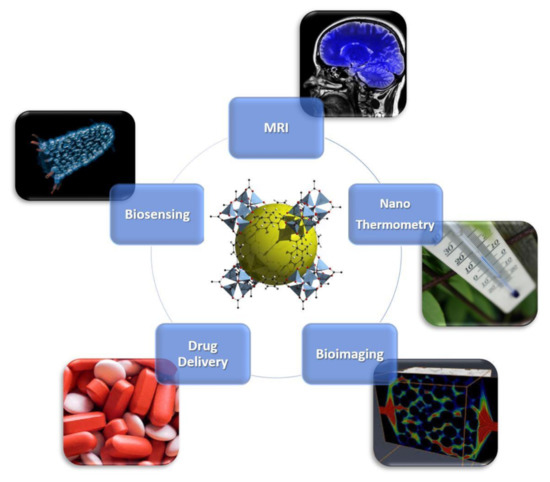 Overview of biomedical Applications of nanometal–organic frameworks (nanoMOFs). Bioimaging is licensed under the Creative Commons Attribution 3.0 License (https://creativecommons.org/licenses/by/3.0/); biosensing is also licensed under the Creative Commons Attribution-Share Alike 3.0 Unported license (https://creativecommons.org/licenses/by-sa/3.0/deed.en); MRI, drug delivery and nanothermometry are royalty-free.