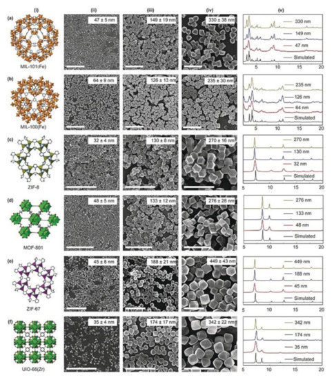 (i): (a) MIL-101(Fe); (b) MIL-100(Fe); (c) ZIF-8. (d) MOF-801; (e) ZIF-67. (f) UIO-66-(Zr). (ii)–(iv) images of representative nanoMOFs of different sizes. Scale bar: 1 μm. (v) Simulated and experimental PXRD (Powder X-Ray Diffraction) patterns of different sized nanoMOFs. Reprinted with permission from [61], Copyright 2020 from John Wiley & Sons, Inc. (Hoboken, NJ, USA).