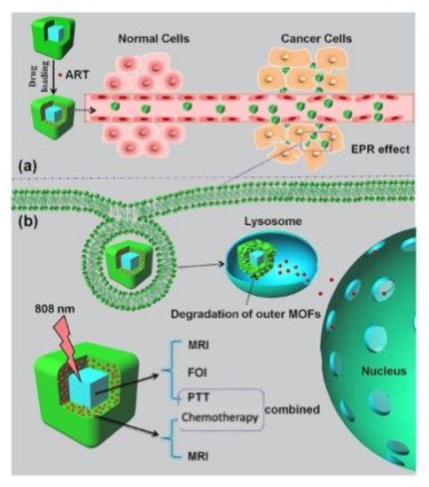 Picture of multifunctional nanoMOFs targeting tumors for combined therapy. (a) Loading and delivery process through the enhanced permeation and retention (EPR) effect. (b) pH-responsive degradation of outer magnetic nanoMOFs for drug release and dual-modal FOI- and MRI-guided cancer therapy in vitro and in vivo. Reprinted with permission from [69], copyright 2020 from Elsevier (Amsterdam, The Netherlands).