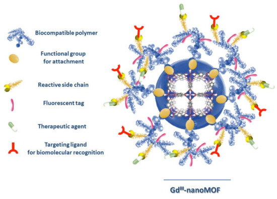 Image of a polymer-functionalized GdIII MOF nanoparticle (shown in the middle) as a biomolecular nanocarrier for targeted imaging and cancer treatment. (Redrawn from [66], copyright 2020 from American Chemical Society, Washington, DC, USA).