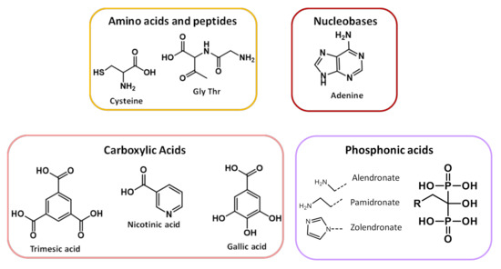 Organic linkers are selected taking into account (i) their capability to favor both exchange magnetic interactions between metal ions and large pores to enable drug encapsulation and (ii) their biocompatibility [47,48]. There are a wide variety of organic linkers that may act as building blocks for the design of biofriendly MOFs, such as amino acids, peptides, proteins, nucleobases, phosphonic acids and carboxylic acids [36,49,50], reported in Scheme 1. The MIL (Materials of Institute Lavoisier) and UIO (University of Oslo) classes (vide infra), based on polycarboxylates ligands, are the most commonly used in biomedicine. Phosphonates, sulfonates, imidazolates, amines, pyridyl, phenolates are also valuable linkers [51].