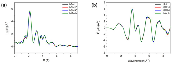 The Fourier transform of Fe-edge EXAFS data are shown in Figure 2. The data were collected at room temperature, where the complex is in the HS state, in both α and β phases. Data show that all of the samples have the same short-range order. The peak at 2.20(1) Å corresponds to the Fe-N distance, consistent with a Fe2+ HS species [31]. The following peaks represent the Fe-C (3.17(1) Å), Fe-C (3.18(1) Å) and Fe-Fe (3.90(5) Å) shells. It is not possible to observe Fe-Fe-Fe multiple scattering in any of the samples of compound 1; the absence of such a peak in the HS state is expected and has been discussed extensively in literature, owing to a greater Fe-N bond length distribution as a result of the degenerate 5T1g state [31,32]. The Debye–Waller factors (2σ2), which are the measure of the thermal and static disorder within a shell, show no significant variation between samples. This suggests that mechanical synthesis or BM do not introduce significate disorder into the structure compared to solution synthesis. In all four cases, the amount of amorphisation is comparable; differences between the values are within the error of the measurement. Therefore, synthesis via mechanochemistry does not introduce amorphisation into this system—even after prolonged grinding in a ball mill as seen in 1-BM90. Full fitting data are available in the Supplementary Materials.