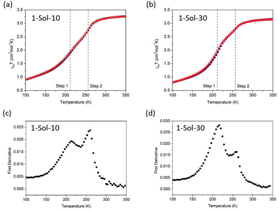 Plots of χMT vs. T for compound three cycles, with the stepped transitions indicated by dashed lines. First cycle: heating ■, cooling ☐; second cycle: heating ▲, cooling ∆; third cycle: heating ▼ and cooling ∇ (a) 1-Sol-10 (b) 1-Sol-30. First derivative of 2nd heating cycle. (c) 1-Sol-10 and (d) 1-Sol-30.