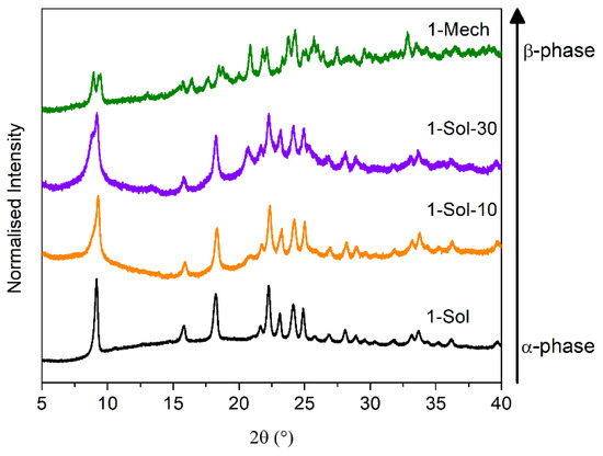 The effect of postsynthetic grinding was monitored using powder diffraction, as shown in Figure 6, which showed the structure remained mostly unchanged after grinding for 10 min (1-Sol-10). The majority of the peaks remained consistent with the exception of the presence of a shoulder on the peak at 8° and the appearance of two peaks at 13° and 21°. Continued grinding for a total of 30 min increased the size of the shoulder at 8° and the peaks at 13° and 21°. The peaks and peak splitting present after 30 min of grinding are consistent with the pattern collected for the β-phase. Grinding 1-Sol also decreased the signal-noise ratio, which is attributed to a lower crystallinity for the β-phase, as previously discussed by Grosjean [27]. The pattern for 1-Sol-30 appeared to be a mixture of the patterns for 1-Sol and 1-Mech.