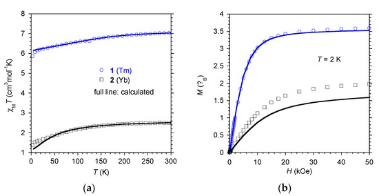 The temperature dependence of the molar magnetic susceptibility, χM, for 1 and 2 between 2 and 300 K is depicted as χMT = f(T) in Figure 2. The values of 7.03 (1) and 2.50 (2) cm3 K mol−1 at 300 K are consistent with anticipated contributions for isolated ions (7.15 cm3 K mol−1 for Tm(III) with a 3H6, S = 1, L = 5, g6 = 7/6 ground state, and 2.57 cm3 K mol−1 for Yb(III) with 2H7/2, S = 1/2, L = 3, g7/2 = 8/7 ground state). When the temperature decreased, χMT continuously diminished for both compounds with a more rapid decrease below 10 K, reaching 5.8 cm3 K mol−1 for 1 and 1.26 cm3 K mol−1 for 2 at 2 K. These thermal dependences of χMT are due to the depopulation of the excited electronic (Stark) levels due to the crystal field effect. The field dependence of the magnetization recorded at 2 K (Figure 2) showed a rapid increase for low fields, and, above ca. 15 kOe, a very smooth augmentation to reach of 3.6 µB (1) and 2.0 µB (2) at 50 kOe; no hysteresis was observed. These values are similar to those reported for Tm(III) [12,14] and Yb(III) [30,31] systems, and they confirm that there is an important splitting of the ground J manifold by the ligands [32,33]. For the ground state with a pure MJ term, the saturation magnetization is given by MS = ½ × J × gJ. The MS values found for 1 and 2 suggest that the doublets with largest MJ (±6 for Tm(III) and between ±7/2 and ±5/2 for Yb(III)) are the ground states.