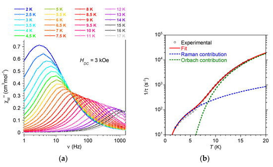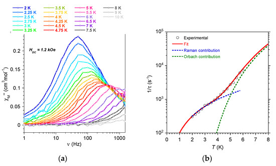 The frequency dependence of the AC signals for 1 was collected between 2 and 30 K for the frequency range 1–1500 Hz in a field of 3 kOe (Figure 3 and Figure S5). The data were fitted at each temperature using a generalized Debye model affording the relaxation time τ [34]. The thermal dependence of τ (Figure 3) clearly indicated the contribution of at least two relaxation mechanisms. This is supported by the distribution width, α, of the relaxation times deduced at each temperature by the analysis of the Cole–Cole plots (χM” = f(χM’), Figure S6) [35]. The values ranged between 0.01 for the high T domain to 0.28 at low T suggesting several contributions to the relaxation at lower temperatures. Spin-phonon processes, such as Raman, Orbach, and field-induced direct pathways, as well as QTM, may concomitantly be operating in the relaxation of mononuclear complexes [36,37]. In the expression of τ−1, given in equation 1, the terms from left to right account, respectively, for the direct, QTM, Raman, and Orbach process, where A, B, C, and n are coefficients and H is the magnetic field, T is the temperature, Ueff is the energy barrier, and τ is the pre-exponential time.