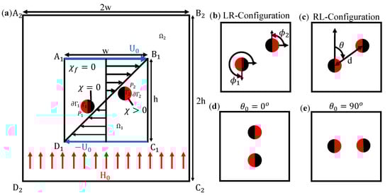 In this article, two equally sized and neutrally buoyant circular Janus particles were placed in a simple shear flow of an incompressible Newtonian fluid, with a density and a dynamic viscosity , under a uniform magnetic field , as seen in Figure 1a. The computational domain consisted of two particle surfaces and and particle domains and , where subscripts 1 and 2 represent Particles 1 and 2, respectively. The domains of both Janus particles were equally sectionalized into a paramagnetic side, with a constant susceptibility, and a non-magnetic side, which corresponds to an anisotropic magnetic particle, as seen in similar studies [37]. The anisotropic property of a paramagnetic Janus particle gives it a unique behavior as opposed to its isotropic counterpart. Under a uniform magnetic field, an isotropic paramagnetic particle will not experience a magnetic angular velocity, but a Janus particle rotates until the particle direction (the normal direction to the internal interface) is parallel to the magnetic field direction [37]. Furthermore, a pair of Janus particles’ initial directions can be classified by a configuration, as shown in Figure 1b, the LR-configuration, and Figure 1c, the RL-configuration. The configurations were seen as the initial directions of the particles. For example, the LR-configuration was when Particle 1 had its magnetic half on the left-hand side and (L), whereas Particle 2 had its magnetic half on the right-hand side and (R), and vice-versa for the RL-configuration. The particles were positioned at an orientation, , and separated by a center-to-center distance, d. Particle 1’s position was below the origin, whereas Particle 2 was above at , , , where (“−”) and (“+”) represent Particles 1 and 2, respectively. The Janus particles have an initial orientation, , that is either at or in between (where the particles are vertical to each other) and (where the particles are horizontal to each other), as shown in Figure 1d,e, respectively.