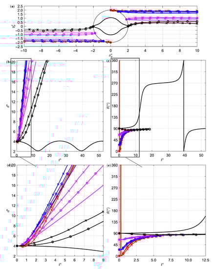 Finally, the LR- and RL-configurations under a magnetic field strength at A/m and at an initial distance were also validated with Seong et al., as shown in Figure 2c for the LR-configuration and Figure 2d for the RL-configuration. The initial particle orientations were , , and for the LR-configuration and , , and for the RL-configuration. The critical orientations represent a boundary between whether the particles will initially attract each other or if they will repel then attract and were approximately and [37]. As can be seen in Figure 2c, for the LR-configuration, the particles attract at and , whereas the particles first repel and then attract at . Similarly, in Figure 2c, for the RL-configuration, the particles attract at and , whereas the particles first repel and then attract at . Once again, the numerical results (shown in lines) quantitatively agreed with the previous authors’ results (shown in symbols), and we used a total number of around 27,000 meshes and a time step of s.