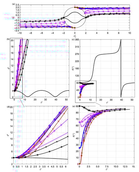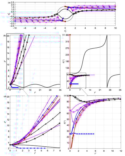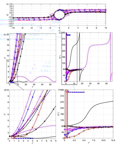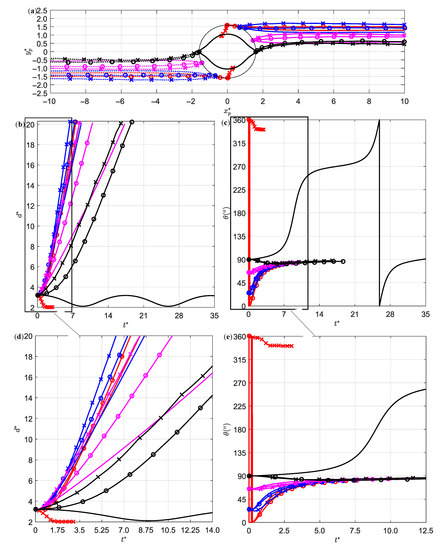 Finally, the particle dynamics were observed at , as seen in Figure 5. In Figure 5a,b,d, the magnetic force was stronger than the viscous force for the initial orientations and at the strength 10,000 A/m, and the particle distances decreased until a chain was formed. In all other cases, however, the viscous force was stronger than the magnetic, and thus, the particle distances increased at different rates. The only exception was when the particles completed periodic orientations at and in the absence of a magnetic field. At the magnetic field strength 10,000 A/m, the particles separated faster at the initial particle orientation of than all other cases, including at the same magnetic field strength. For the magnetic field strength A/m, the following particle orientations are given from the fastest separation to the slowest: , , , and . In fact, the particle separation rate for A/m and was initially slower because the particle orientation rotated backwards, as seen in Figure 5c,e, before monotonically increasing. Similar to other initial distances and under a uniform magnetic field, the particles with an initial orientation monotonically decreased and then increased. The rates of the orientation decreasing and/or increasing, the rate of the periodic orientation, and whether or not a chain forms depended on the particles’ positions in the fluid domain and their initial orientations. When the particles were further away from the origin, the particles separated faster and approached .